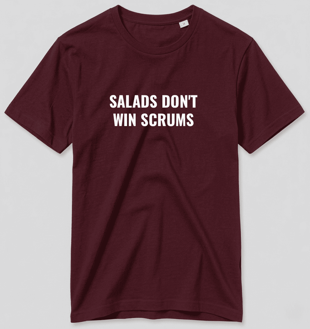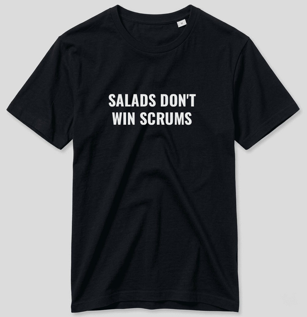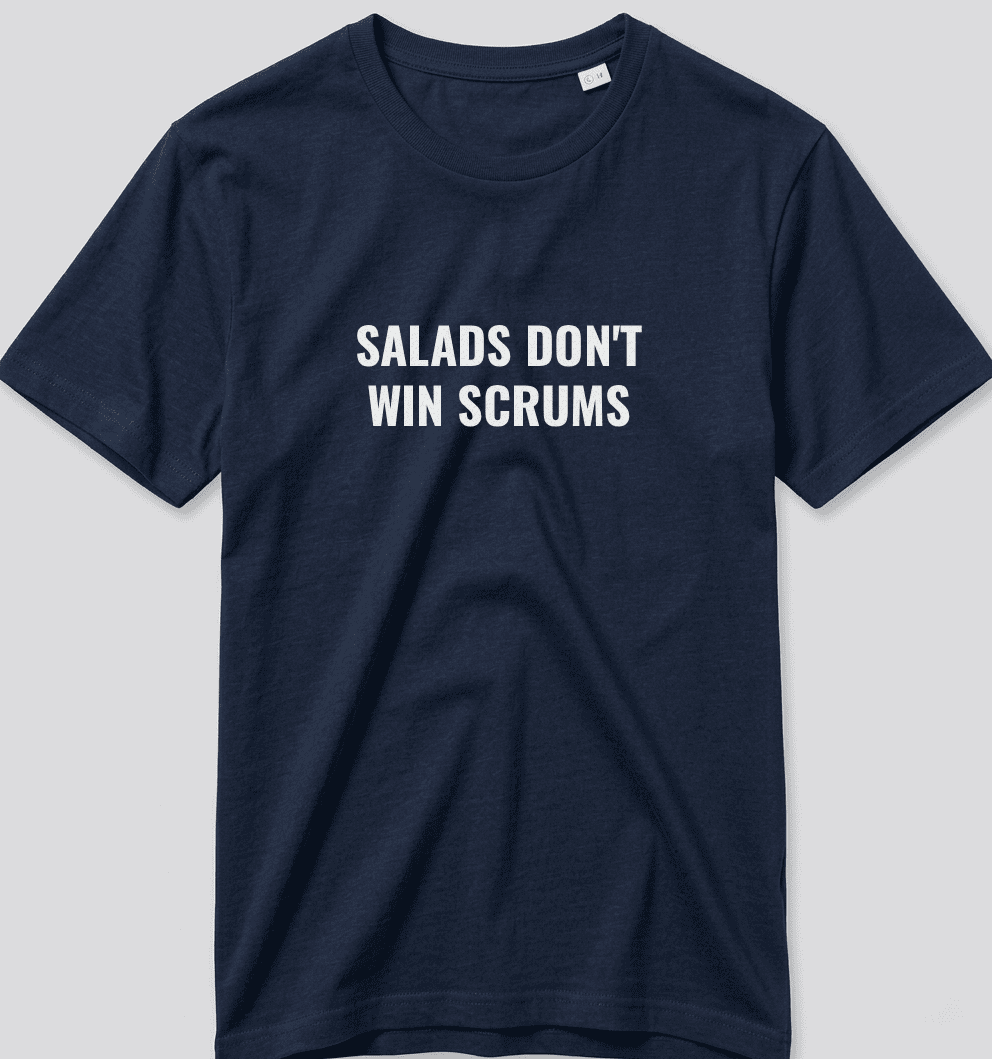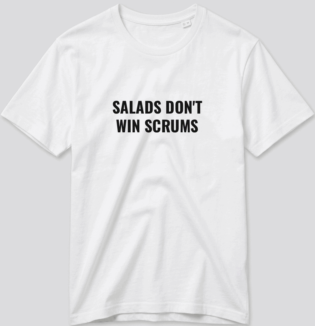 On ne va pas se raconter d’histoires : une mêlée, ça se gagne avec du muscle et du métier, pas avec de la laitue dans le ventre. Inspiré par la punchline iconique du pilier Ox Nché, ce t-shirt rugby « Salads Don’t Win Scrums » est dédié aux piliers, aux talonneurs, et à tous ceux qui savent qu’un match se gagne d’abord dans l’assiette.